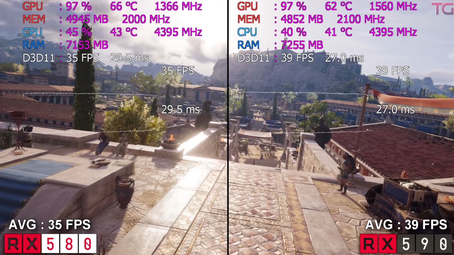 어쌔신 크리드 오디세이 울트라에서 돌렸을 때 FHD 기준으로 각 평균 프레임은 35, 39로 RX590이 RX580에 대비하여 약 10% 우세한 성능을 보여주었습니다.