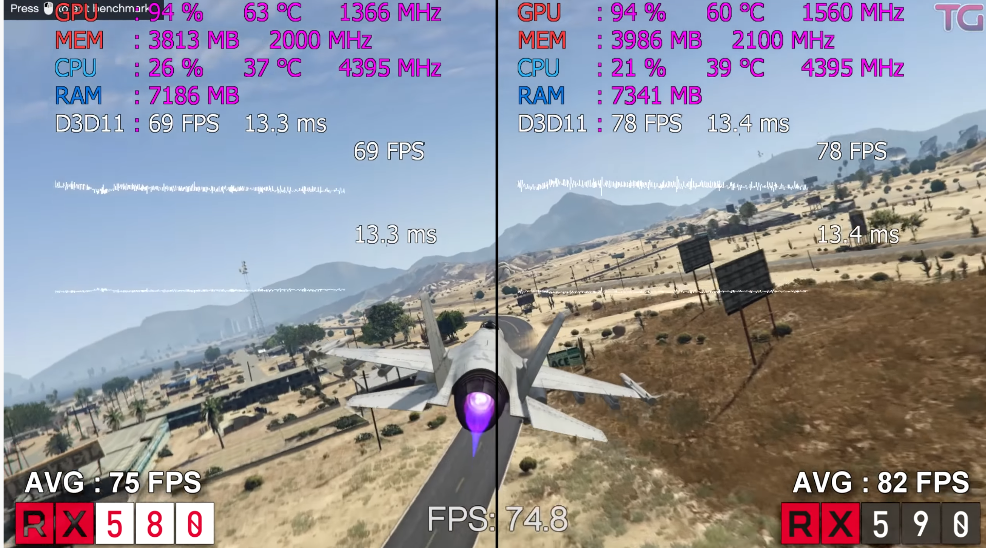 GTA 5 매우 높음에서 돌렸을 때 FHD 기준으로 각 평균 프레임은 75, 82로 RX590이 RX580에 대비하여 약 10% 우세한 성능을 보여주었습니다. 게임마다 편차가 있지만 종합적으로 보았을 때 RX590이 RX580에 대비하여 약 9% 우세한 게임 성능을 가지고 있다고 볼 수 있겠네요.