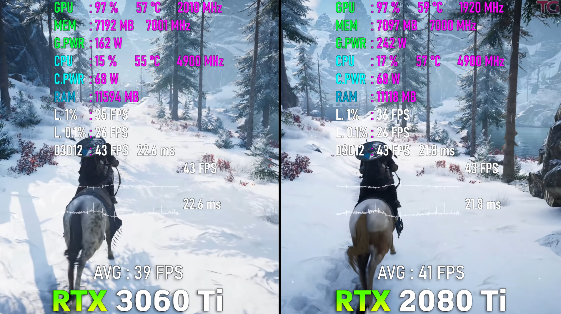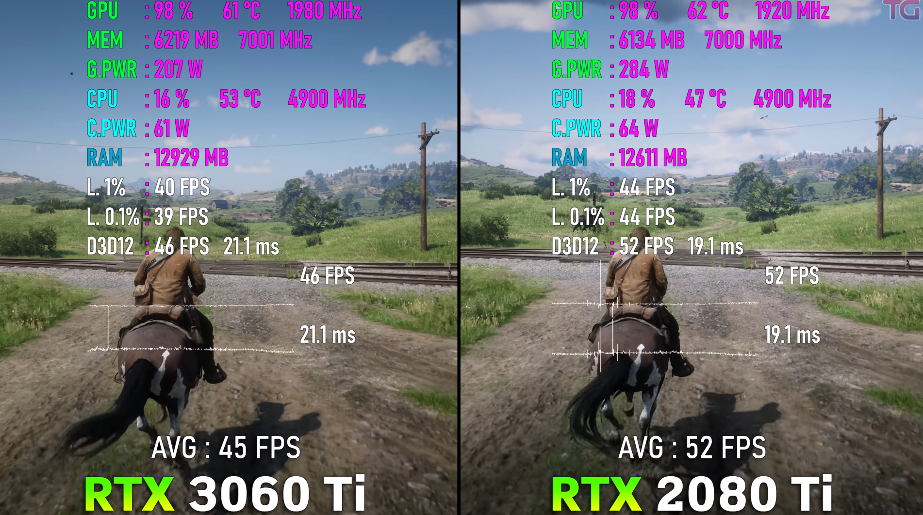 레드 데드 리뎀션 2 울트라에서 돌렸을 때 4K 기준으로 각 평균 프레임은 45, 52로 RTX2080 Ti가 RTX3060 Ti 대비 약 15% 우세한 성능을 보여주었습니다.