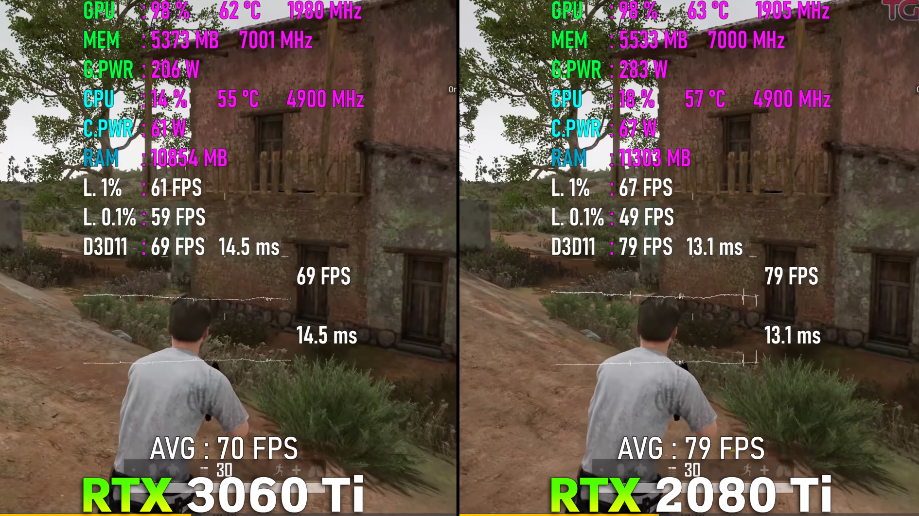 배틀그라운드 울트라에서 돌렸을 때 4K 기준으로 각 평균 프레임은 70, 79로 RTX2080 Ti가 RTX3060 Ti 대비 약 13% 우세한 성능을 보여주었습니다.
