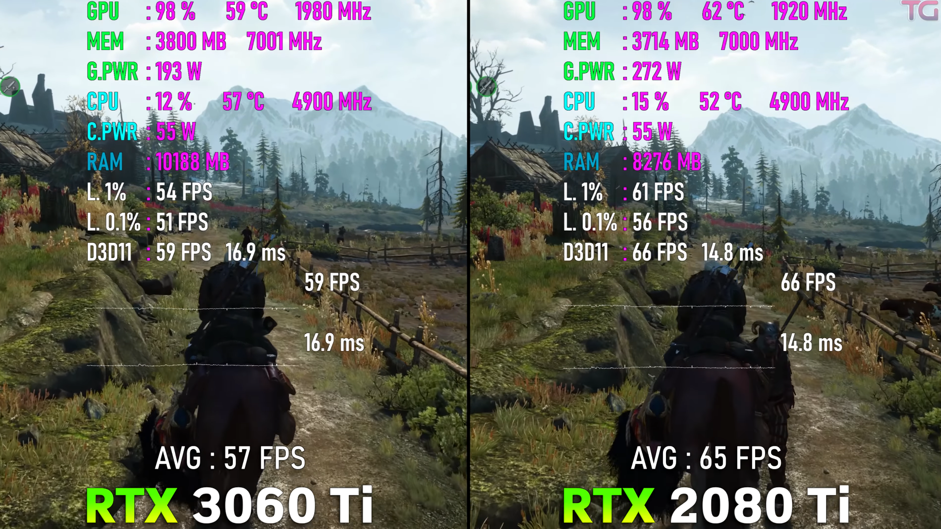 더 위쳐 3 울트라에서 돌렸을 때 4K 기준으로 각 평균 프레임은 57, 65로 RTX2080 Ti가 RTX3060 Ti 대비 약 14% 우세한 성능을 보여주었습니다.