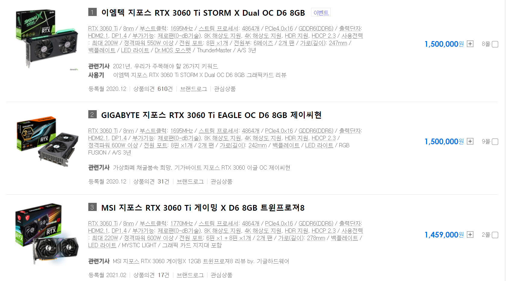 첫 출시 당시에는 50만원 중반에 형성되어 있지만 RTX3060의 채굴 성능이 반토막이 났다는 소식에 RTX3060 Ti 이상 그래픽카드의 가격은 더욱 뛰어올랐습니다.