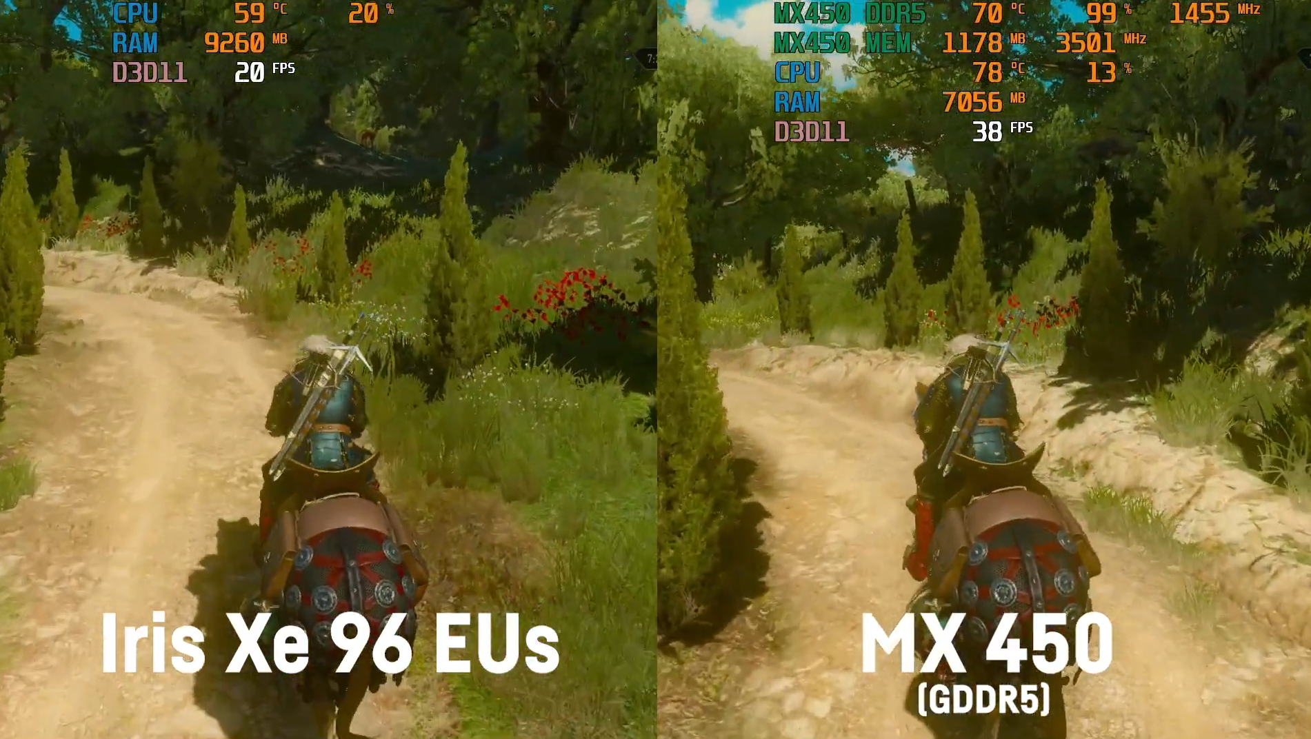 더 위쳐 3 중간에서 FHD로 돌렸을 때 각 프레임은 20, 38로 MX450이 i7-1165G7보다 약 2배 이상 가까운 성능을 보여주었습니다.