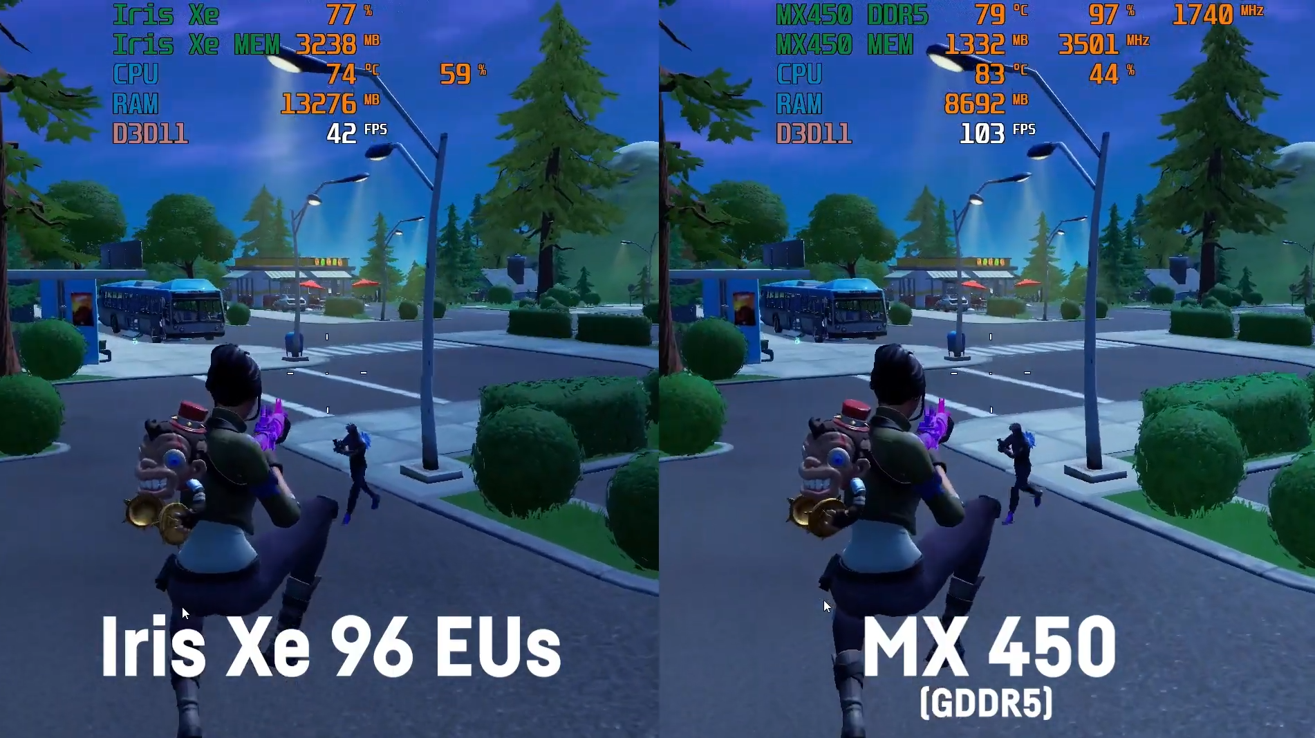 그렇다면 엔비디아에서 내세우는 노트북 모바일 그래픽 MX450과 인텔에서 발표한 내장 그래픽 중 가장 높은 성능을 보여주는 i7-1165G7의 내장 그래픽 성능 차이는 얼마나 날까요?