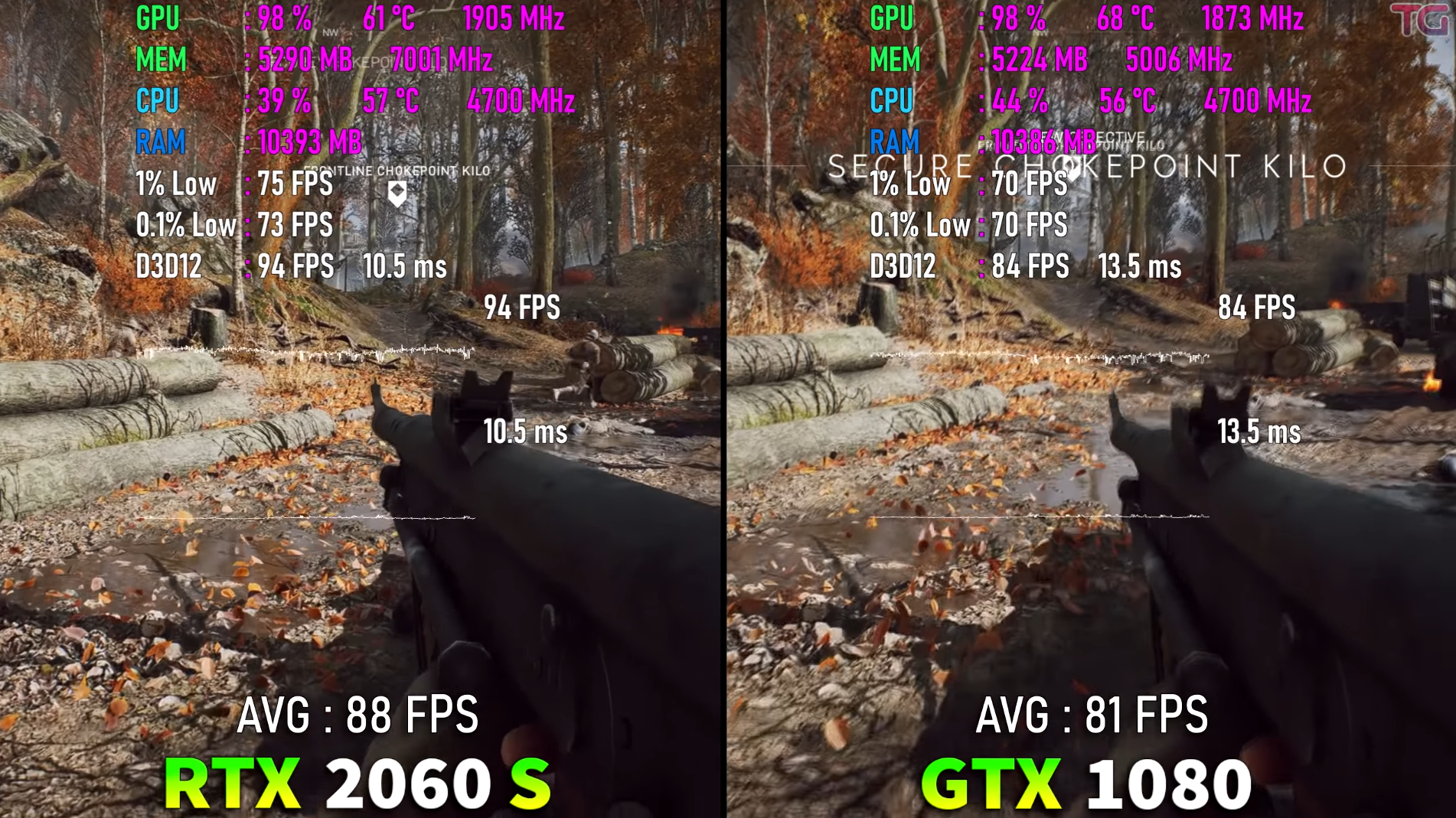 배틀필드 5 울트라에서 돌렸을 때 QHD 기준으로 각 평균 프레임은 88, 81로 RTX2060 Super가 GTX1080 보다 약 10% 우세한 성능을 보여주었습니다.
