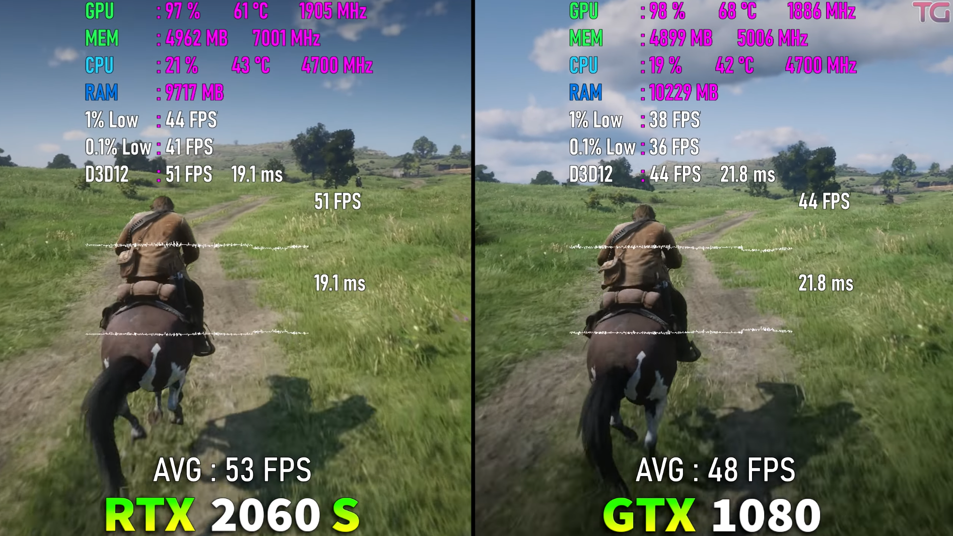 레드 데드 리뎀션 2 울트라에서 돌렸을 때 QHD 기준으로 각 평균 프레임은 53, 48로 RTX2060 Super가 GTX1080 보다 약 11% 우세한 성능을 보여주었습니다.