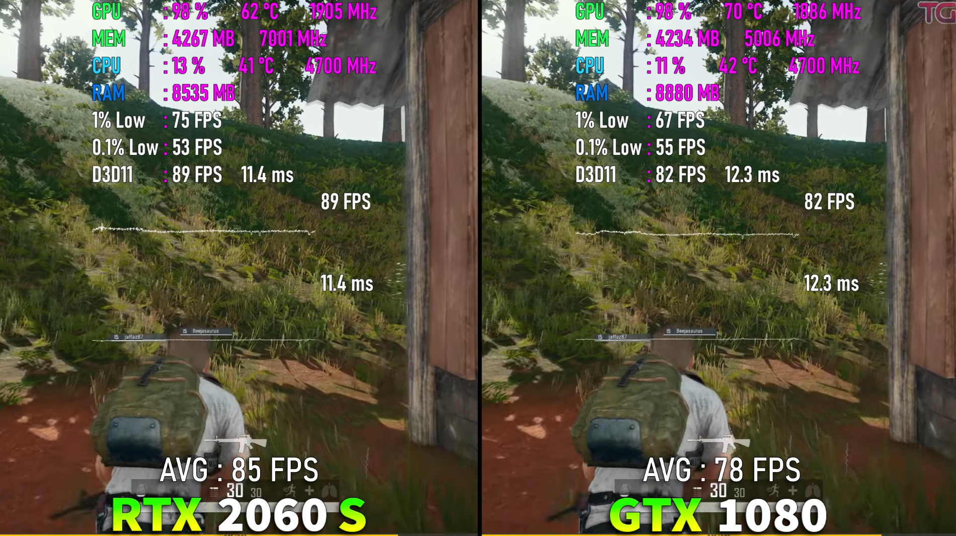 배틀그라운드 5 울트라에서 돌렸을 때 QHD 기준으로 각 평균 프레임은 85, 78로 RTX2060 Super가 GTX1080 보다 약 13% 우세한 성능을 보여주었습니다.