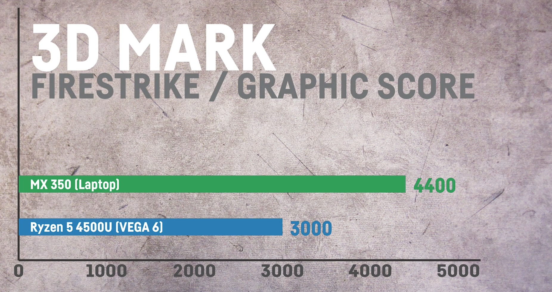 파이어 스트라이크 벤치마크 그래픽 점수 결과를 보시면 MX350의 점수는 4400점, 라이젠5 4500U의 점수는 3000점으로 MX350이 라이젠5 4500U 내장 그래픽보다 33% 더 우세한 성능을 알 수 있습니다.