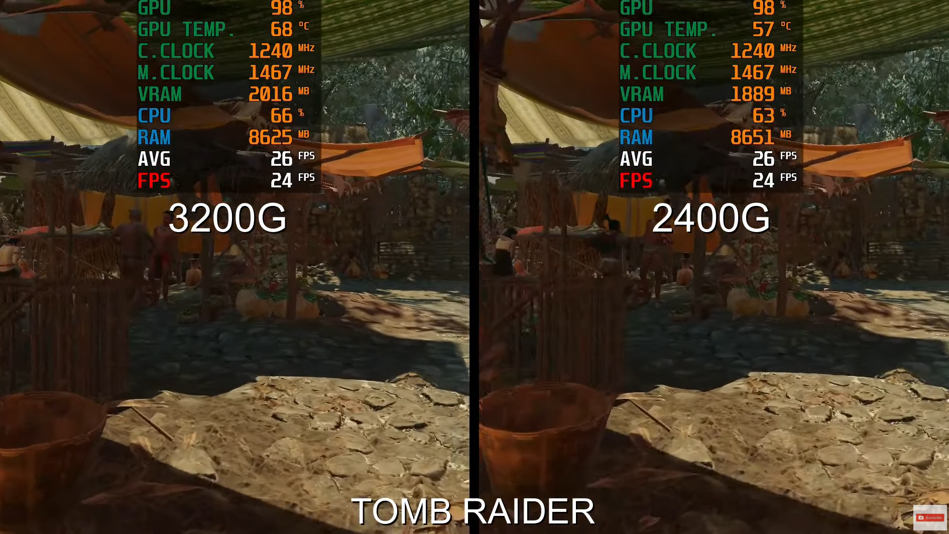 쉐도우 오브 더 툼레이더 낮음에서 돌렸을 때 FHD을 기준으로 각 평균 프레임은 26으로 라이젠 3200G와 라이젠 2400G는 서로 동급의 성능을 보여주었습니다.