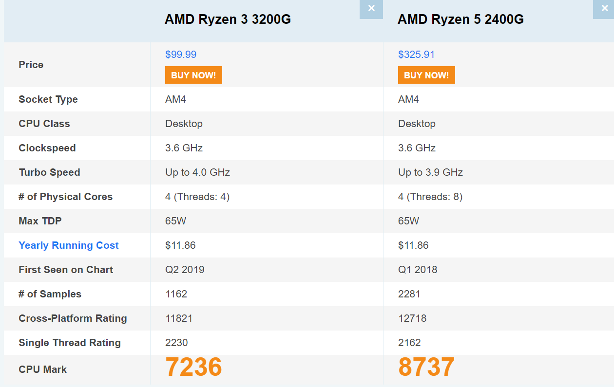 cpubenchmark에서 CPU 멀티 점수를 보면 라이젠 3200G는 7236점, 라이젠 2400G는 8737점으로 라이젠 2400G가 라이젠 3200G보다 약 20% 우세한 성능을 보여주고 있습니다.