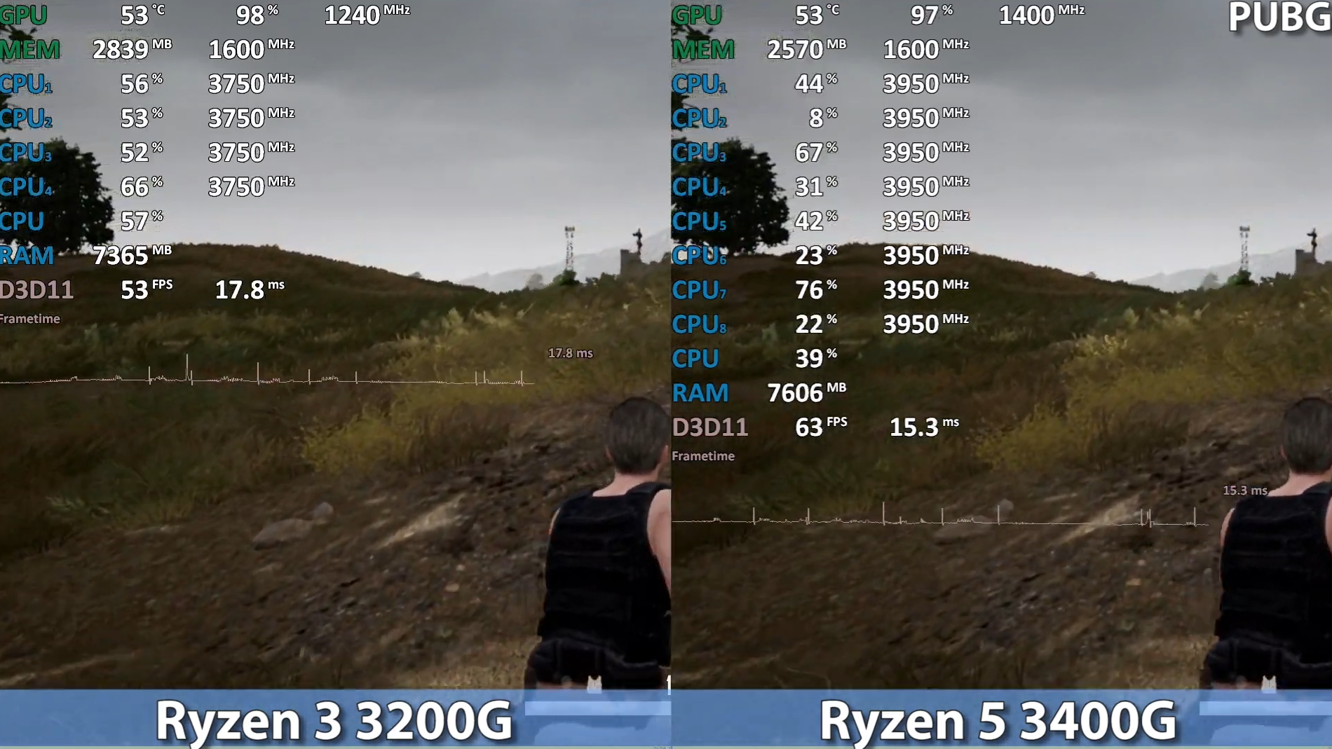 배틀그라운드 낮음에서 돌렸을 때 FHD 렌더링 스케일(70%)을 기준으로 각 프레임은 53, 63으로 라이젠 3400G는 라이젠 3200G 대비 약 19% 우세한 성능을 보여주었습니다.