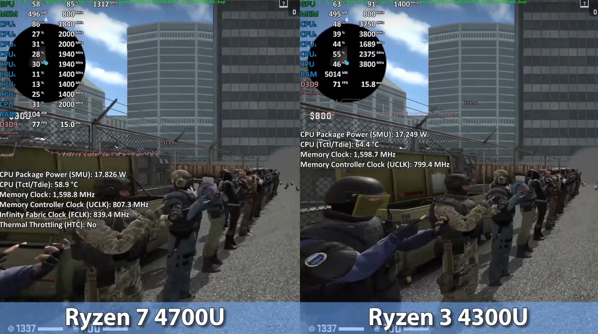 카운터 스트라이크 낮음에서 FHD를 기준으로 돌렸을 때, 각 프레임은 77, 71로 라이젠 4700U이 라이젠 4300U보다 약 9% 우세한 성능을 보여주었습니다.