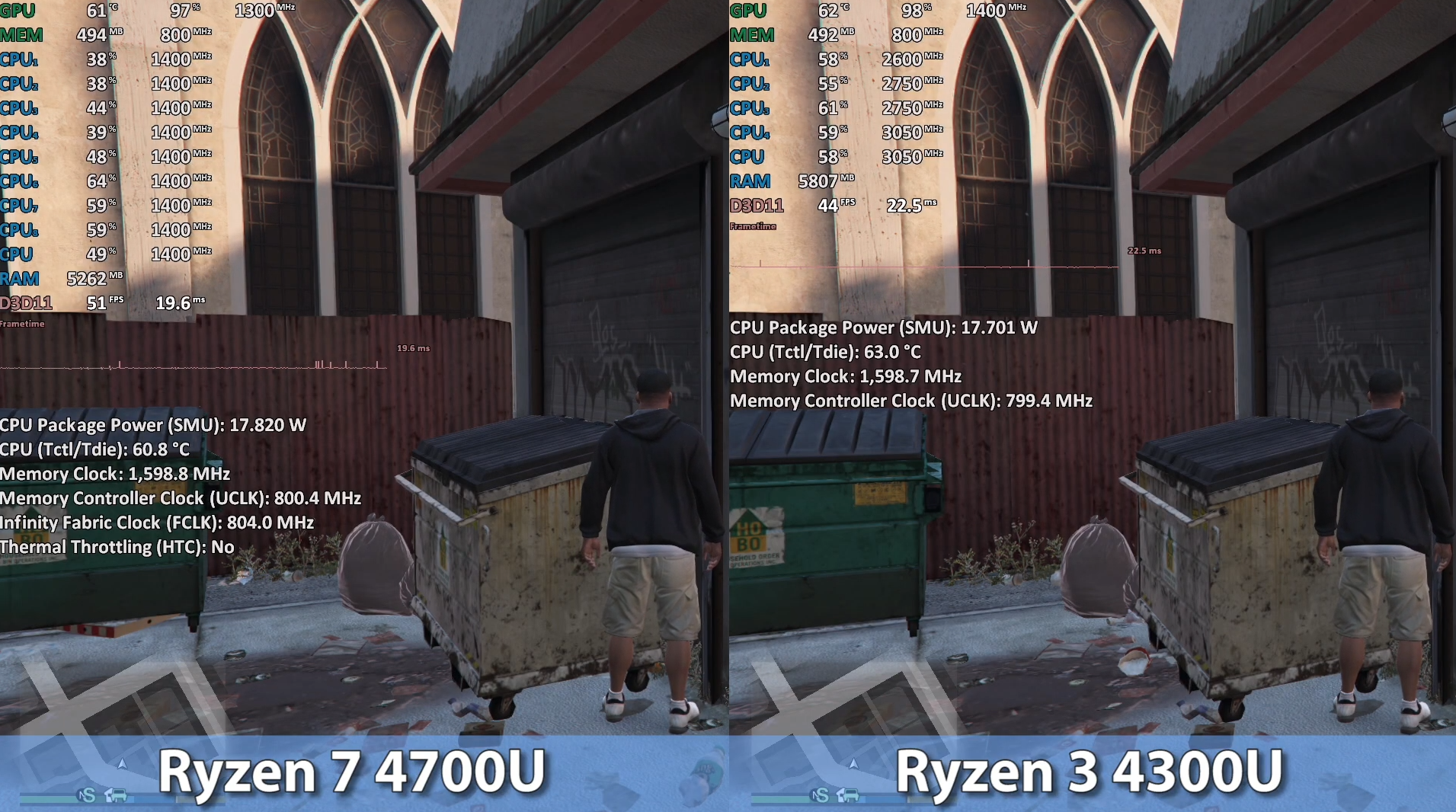 GTA 5 중간에서 FHD를 기준으로 돌렸을 때, 각 프레임은 51, 44으로 라이젠 4700U이 라이젠 4300U보다 약 16% 우세한 성능을 보여주었습니다.