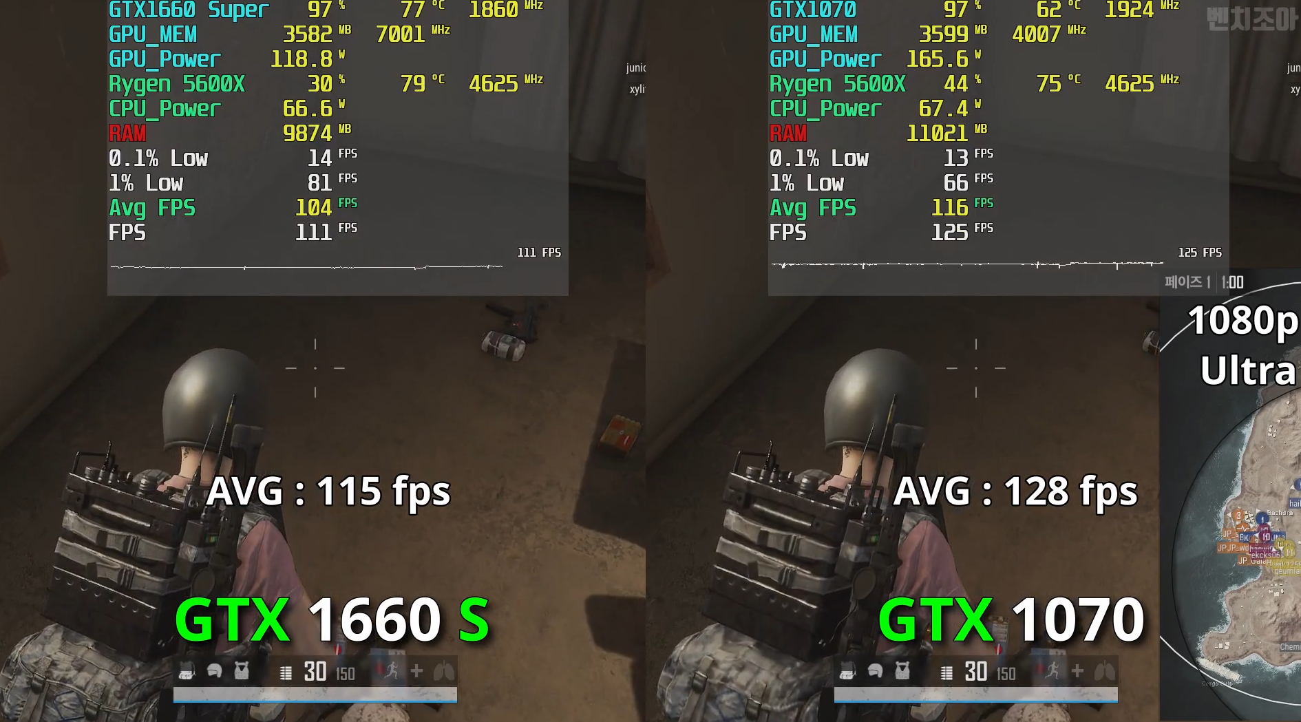 배틀그라운드 울트라에서 돌렸을 때 FHD을 기준으로 각 평균 프레임은 115, 128로 GTX1070이 GTX1660 Super보다 약 11% 우세한 성능을 보여주었습니다.