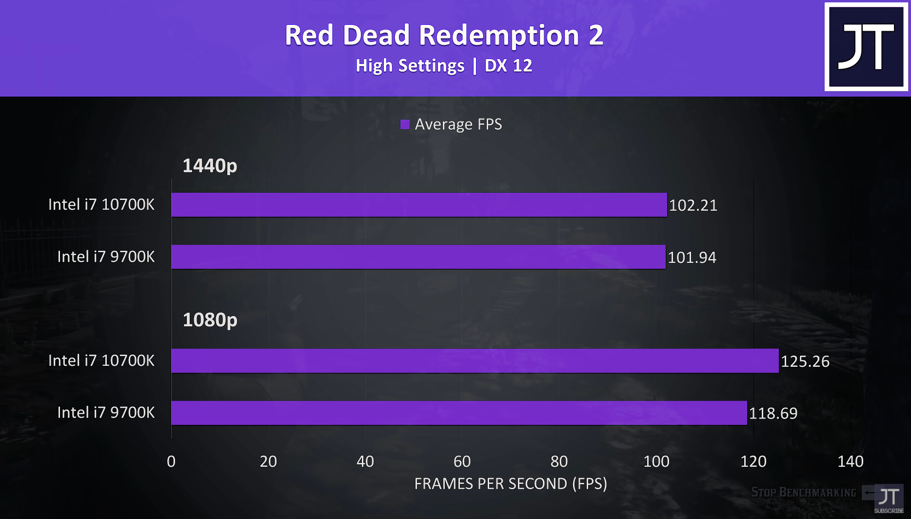 레드 데드 리뎀션 2 높음에서 FHD 기준으로 각 평균 프레임은 125, 118로 인텔 i7-10700K가 인텔 i7-9700K 비해 약 6% 우세한 성능을 보여주었습니다.