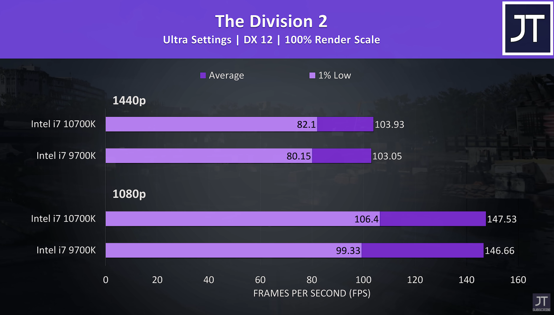더 디비젼 2 울트라에서 FHD 기준으로 각 평균 프레임은 147, 146으로 인텔 i7-10700K와 인텔 i7-9700K 동급의 성능을 보여주었습니다.