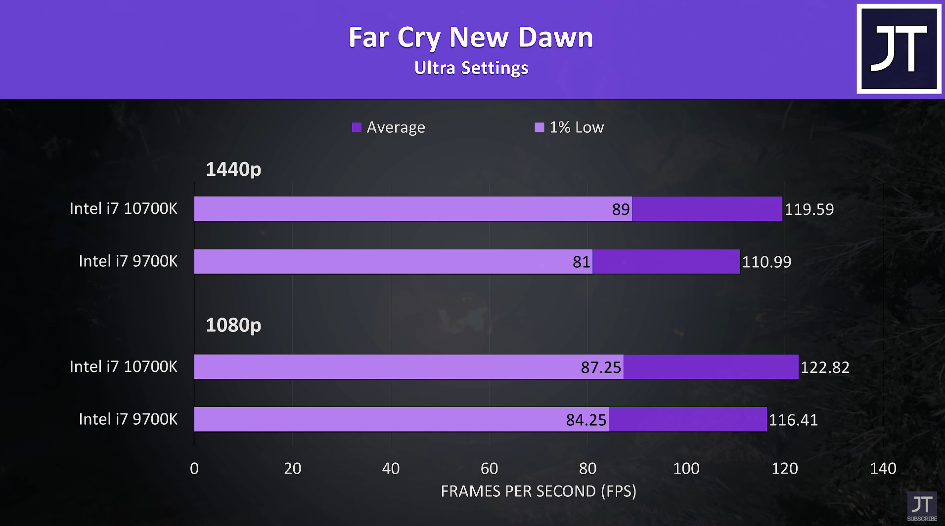 파크라이 뉴던 울트라에서 FHD 기준으로 각 평균 프레임은 122, 116으로 인텔 i7-10700K와 인텔 i7-9700K 비해 약 5% 우세한 성능을 보여주었습니다.