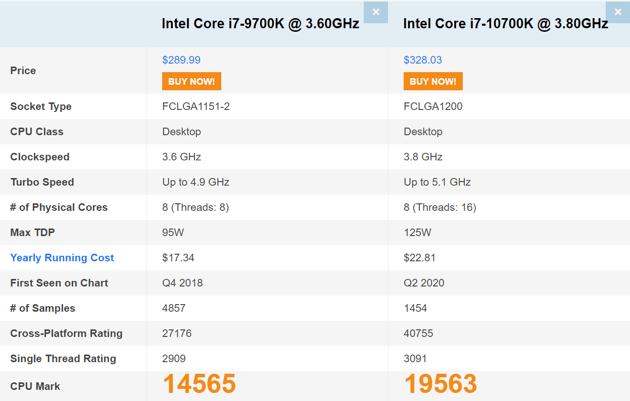 cpubenchmark.com에서 확인한 결과 인텔 i7-10700K이 인텔 i7-9700K에 비해 약 34% 우세한 멀티 성능을 보여주었습니다. 8쓰레드 차이와 클럭 차이가 나온 결과인 것 같네요.