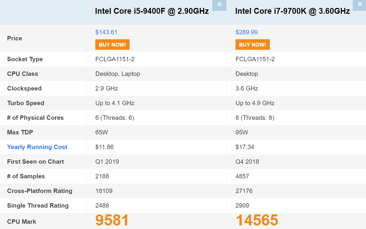 cpubenchmark.com에서 확인한 결과 인텔 i7-9700K이 인텔 i5-9400F에 비해 약 50% 우세한 멀티 성능을 보여주었습니다.