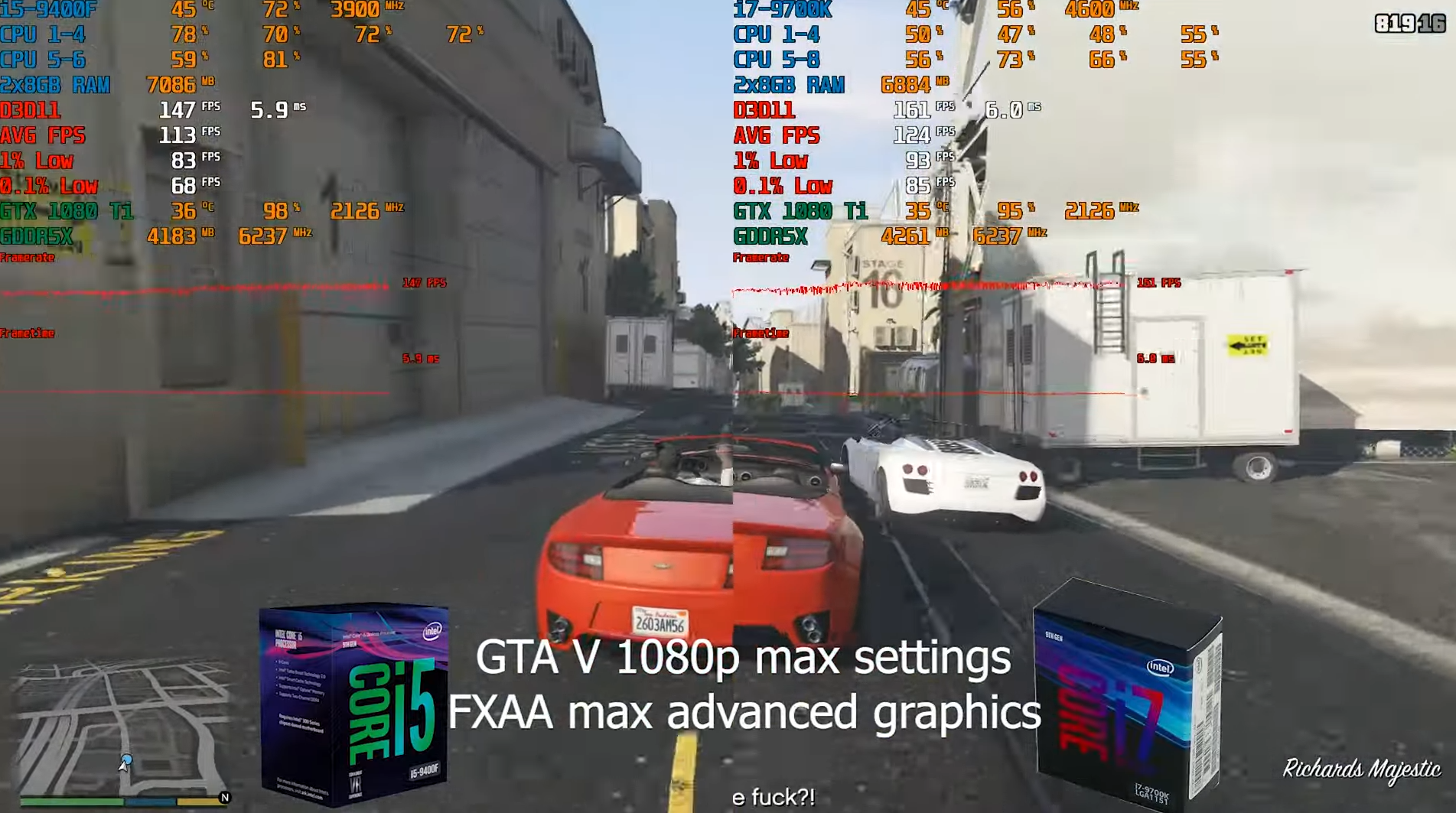 GTA 5 풀 옵션에서 FHD 기준으로 각 평균 프레임은 113, 124로 인텔 i7-9700K는 인텔 i5-9400F에 비해 약 10% 우세한 성능을 보여주었습니다.