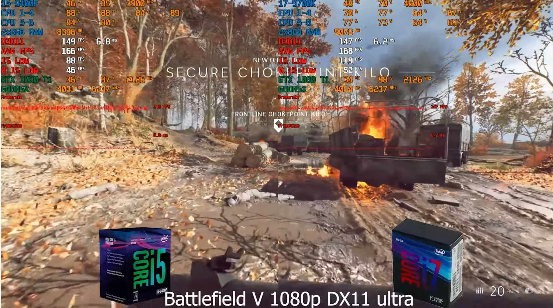 배틀필드 울트라에서 FHD 기준으로 각 평균 프레임은 166, 168로 인텔 i7-9700K와 인텔 i5-9400F는 거의 동급의 성능을 보여주었습니다.