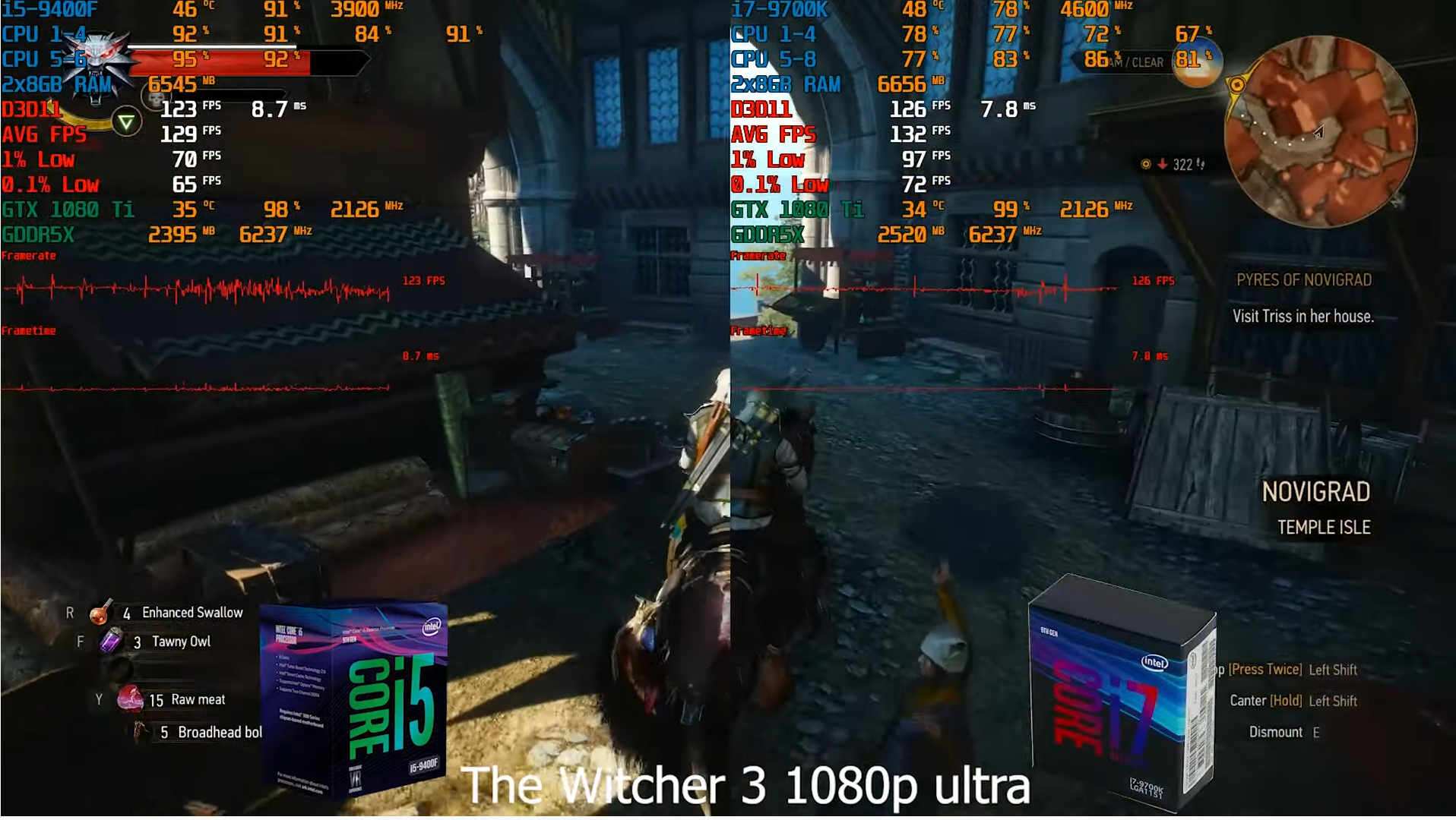 더 위쳐 3 울트라에서 FHD 기준으로 각 평균 프레임은 129, 132로 인텔 i7-9700K는 인텔 i5-9400F에 비해 약 3% 우세한 성능을 보여주었습니다.