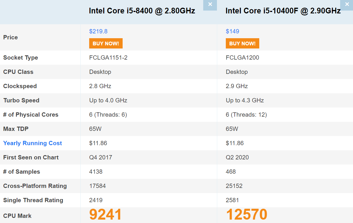 인텔 i5-10400F가 인텔 i5-8400보다 6쓰레드를 더 가지고 있으며 클럭이 소폭 높고 L3 캐시에서 3MB가 더 많기 때문에 CPU 성능에 있어서는 인텔 i5-10400F쪽이 유리한 것으로 보입니다.