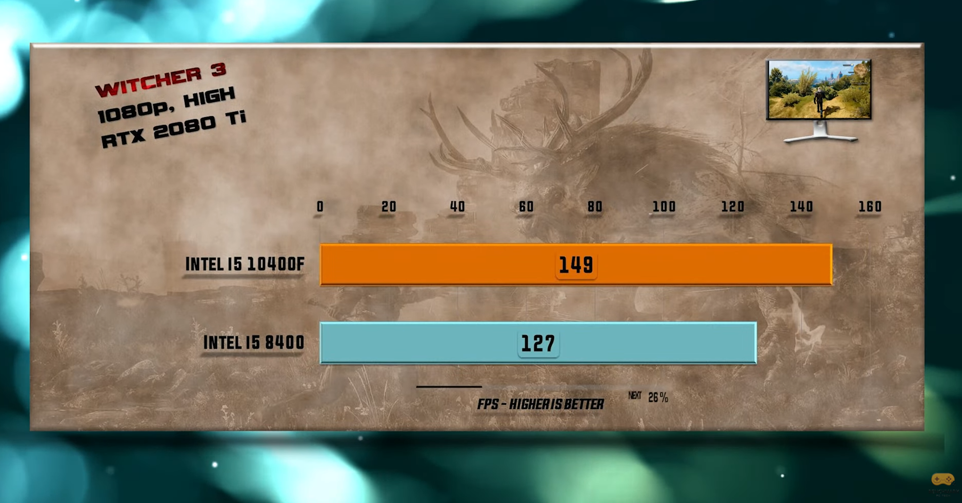 더 위쳐 3 높음에서 FHD 기준으로 각 평균 프레임은 127, 149로 인텔 i5-10400F가 인텔 i5-8400에 비해 약 17% 우세한 성능을 보여주었습니다.