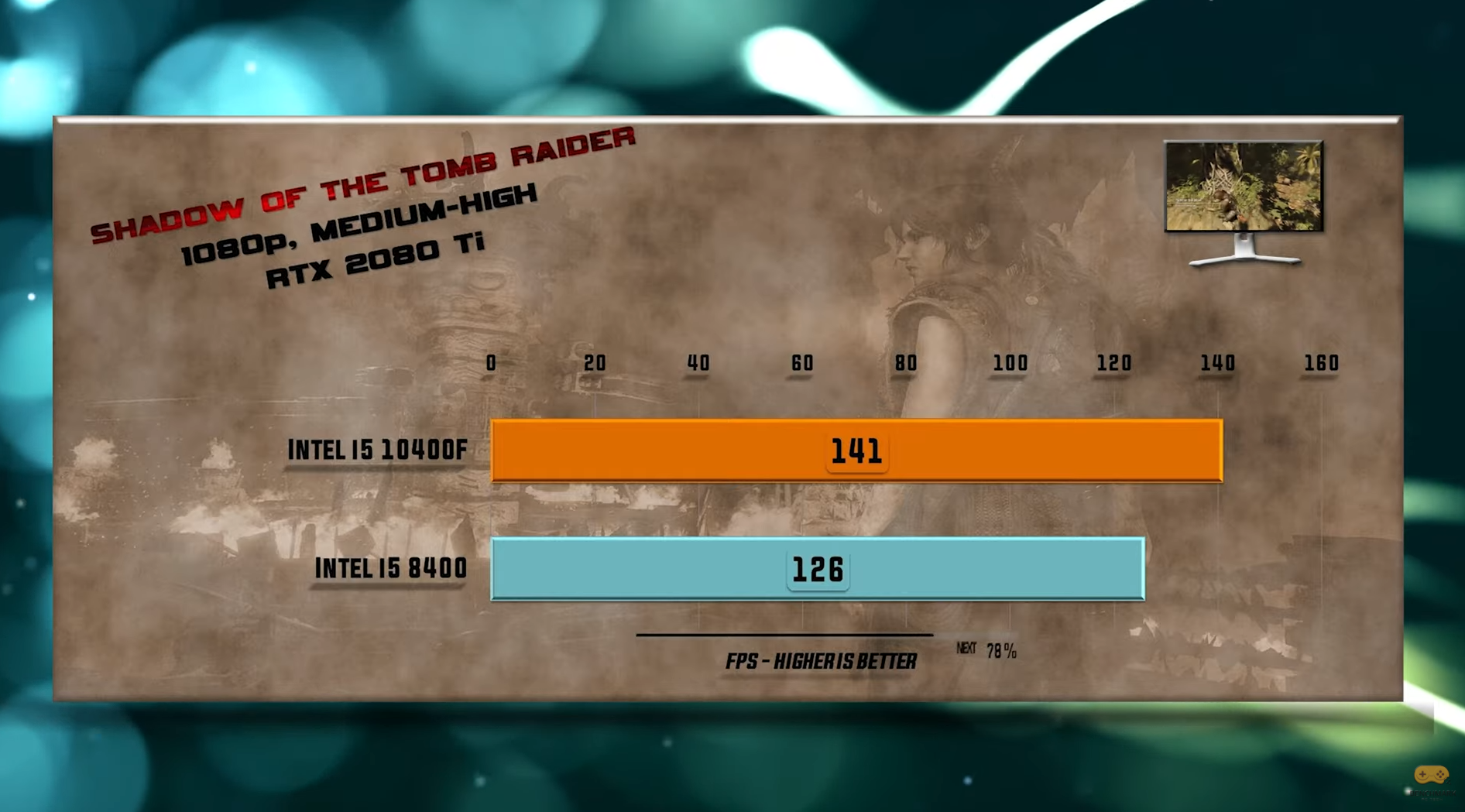 쉐도우 오브 더 툼레이더 높음에서 FHD 기준으로 각 평균 프레임은 126, 141으로 인텔 i5-10400F가 인텔 i5-8400에 비해 약 12% 우세한 성능을 보여주었습니다.