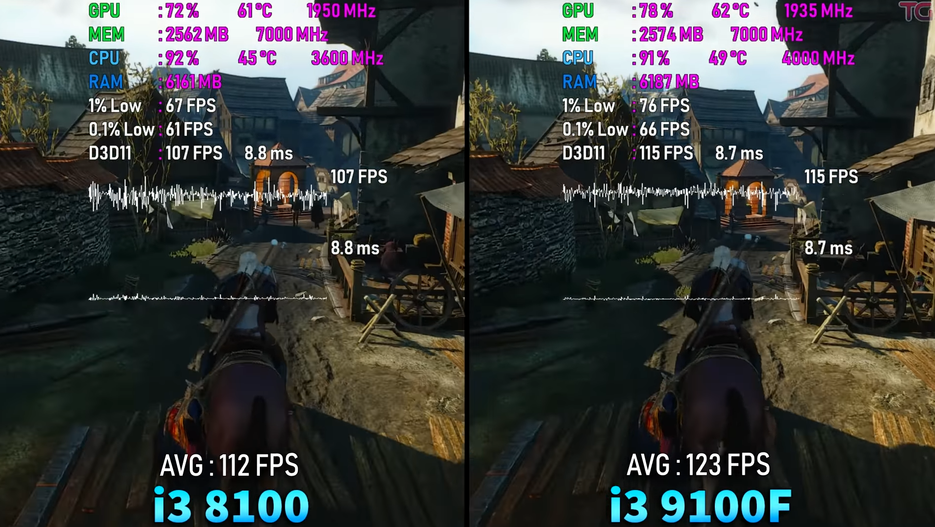 더 위쳐 3 울트라에서 FHD 기준으로 각 평균 프레임은 112, 123으로 인텔 i3-9100F가 인텔 i3-8100 비해 약 10% 우세한 성능을 보여주었습니다.