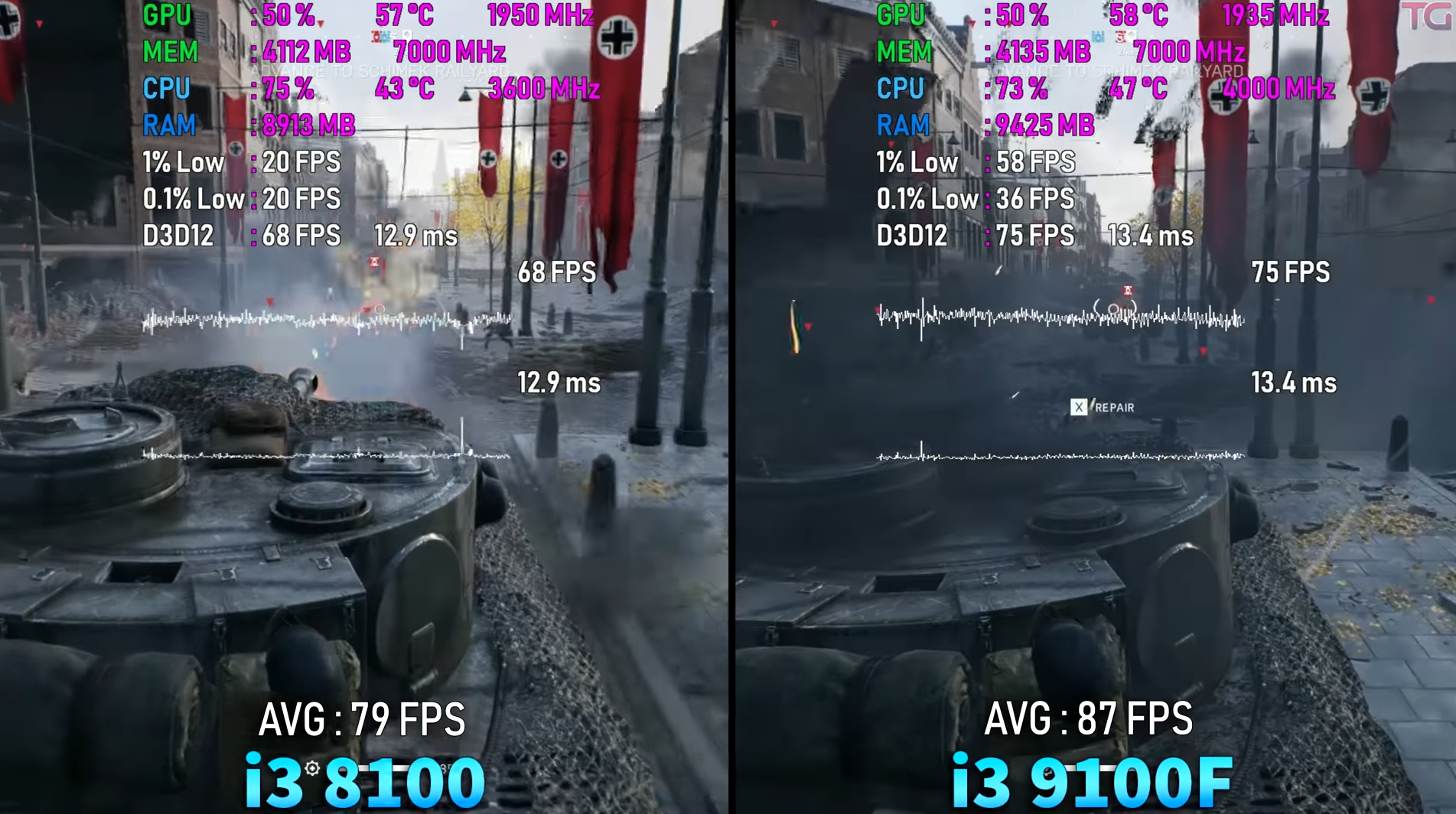 배틀필드 5 울트라에서 FHD 기준으로 각 평균 프레임은 79, 87로 인텔 i3-9100F가 인텔 i3-8100 비해 약 10% 우세한 성능을 보여주었습니다.