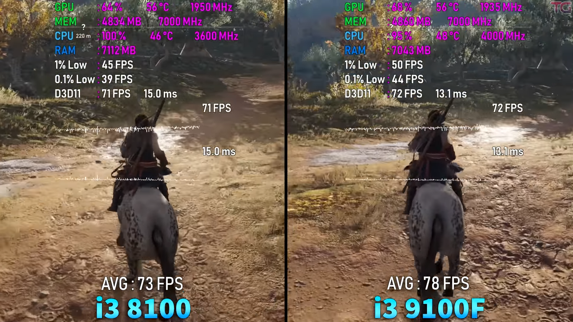 어쌔신 크리드 오디세이 매우 높음에서 FHD 기준으로 각 평균 프레임은 73, 78로 인텔 i3-9100F가 인텔 i3-8100 비해 약 7% 우세한 성능을 보여주었습니다.