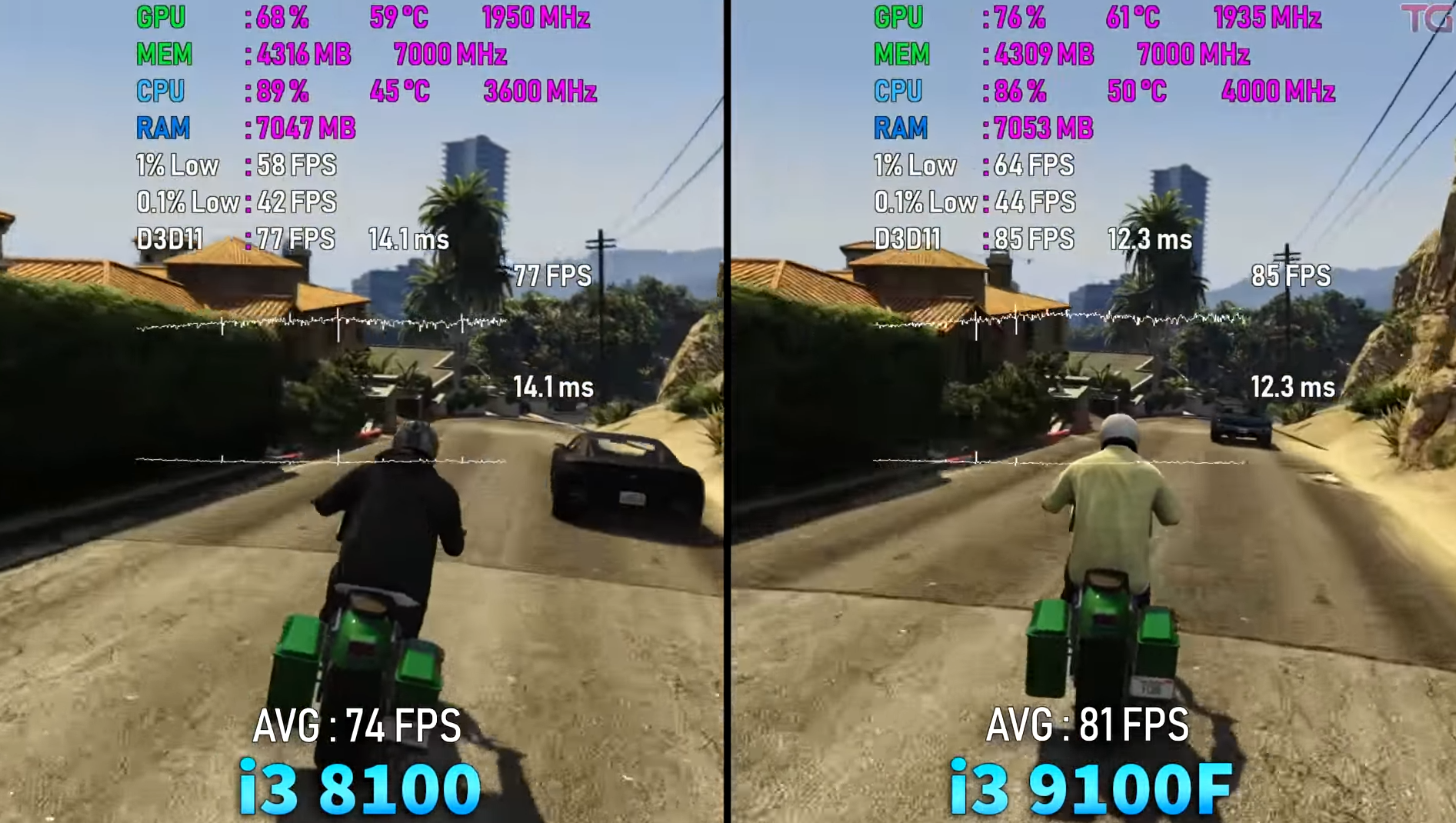 GTA 5 매우 높음에서 FHD 기준으로 각 평균 프레임은 74, 81로 인텔 i3-9100F가 인텔 i3-8100 비해 약 10% 우세한 성능을 보여주었습니다.