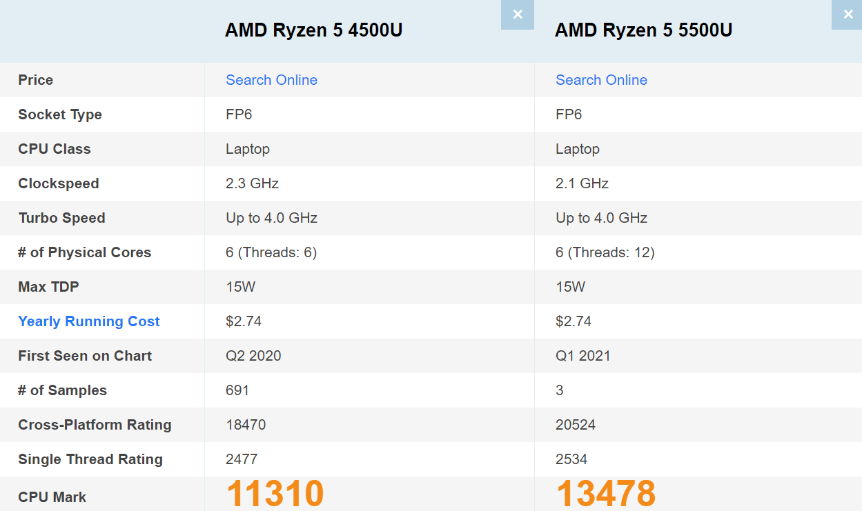 cpubenchmark.com에 따르면 라이젠5 5500U가 라이젠5 4500U보다 약 19% 우세한 멀티 성능을 가진다고 나와있네요. 6쓰레드를 더 가지고 있기 때문에 성능에서 우위를 점하고 있는 것 같습니다.