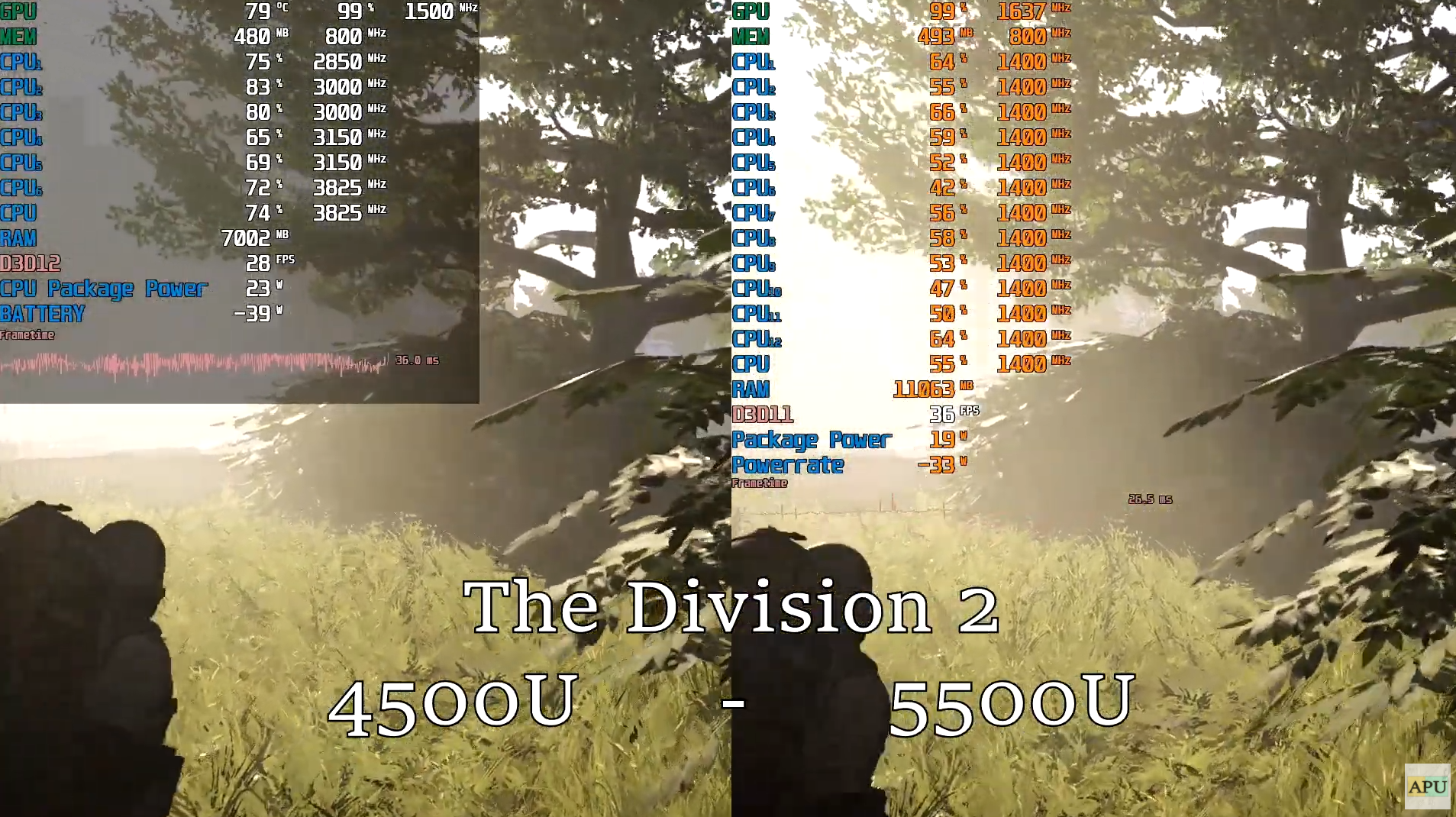더 디비전 2 낮음에서 FHD 기준으로 각 프레임은 28, 36으로 라이젠 5500U는 라이젠 4500U보다 약 25% 우세한 성능을 보여주었습니다.
