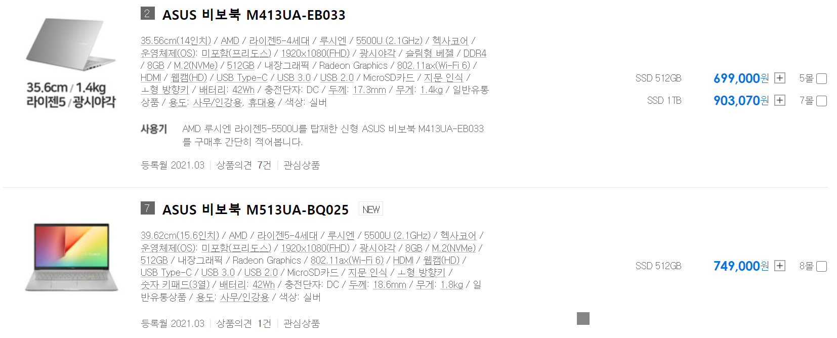 15.6인치 노트북을 기준으로 보았을 때 라이젠 5500U 노트북의 최저가는 75만원, 라이젠 4500U의 최저가는 53만원으로 나와있습니다.