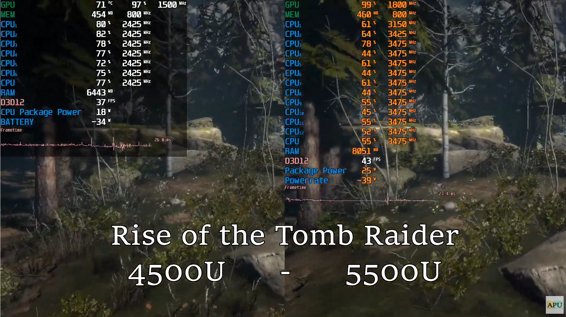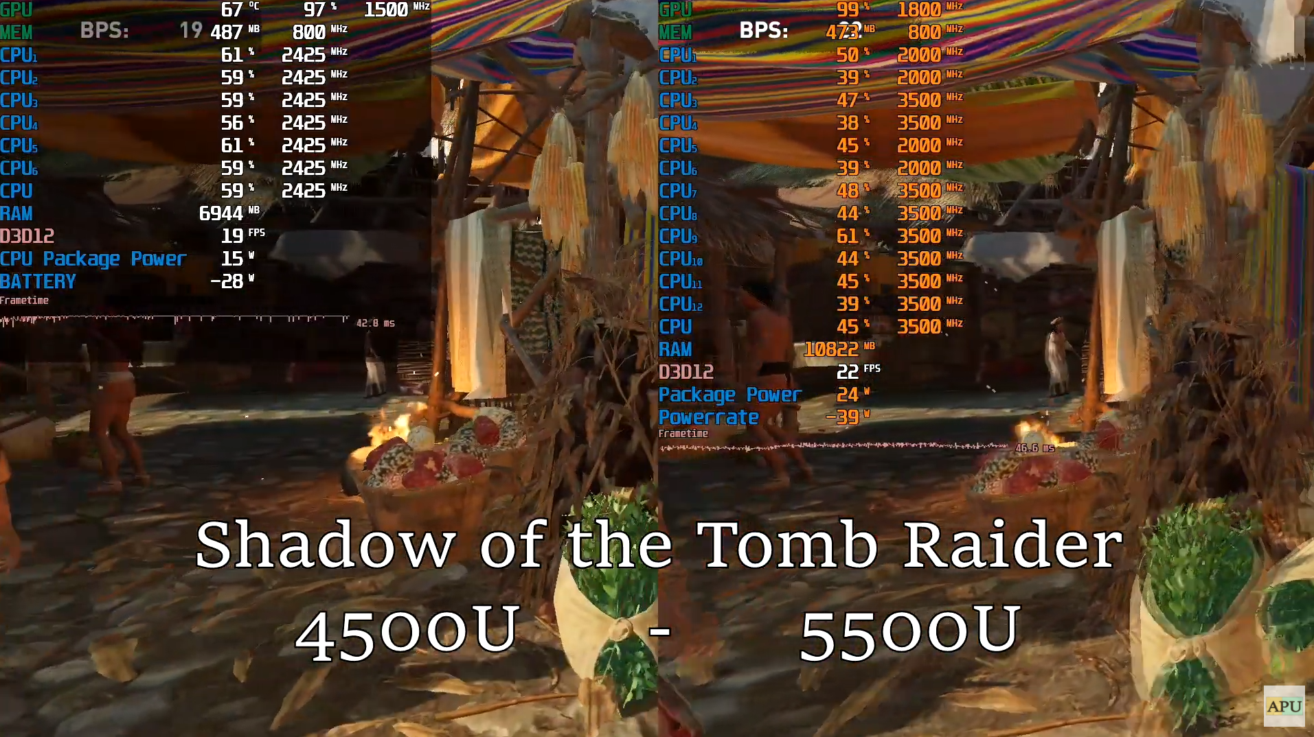 쉐도우 오브 더 툼레이더 낮음에서 HD 기준으로 각 프레임은 19, 22로 라이젠 5500U는 라이젠 4500U보다 약 14% 우세한 성능을 보여주었습니다.