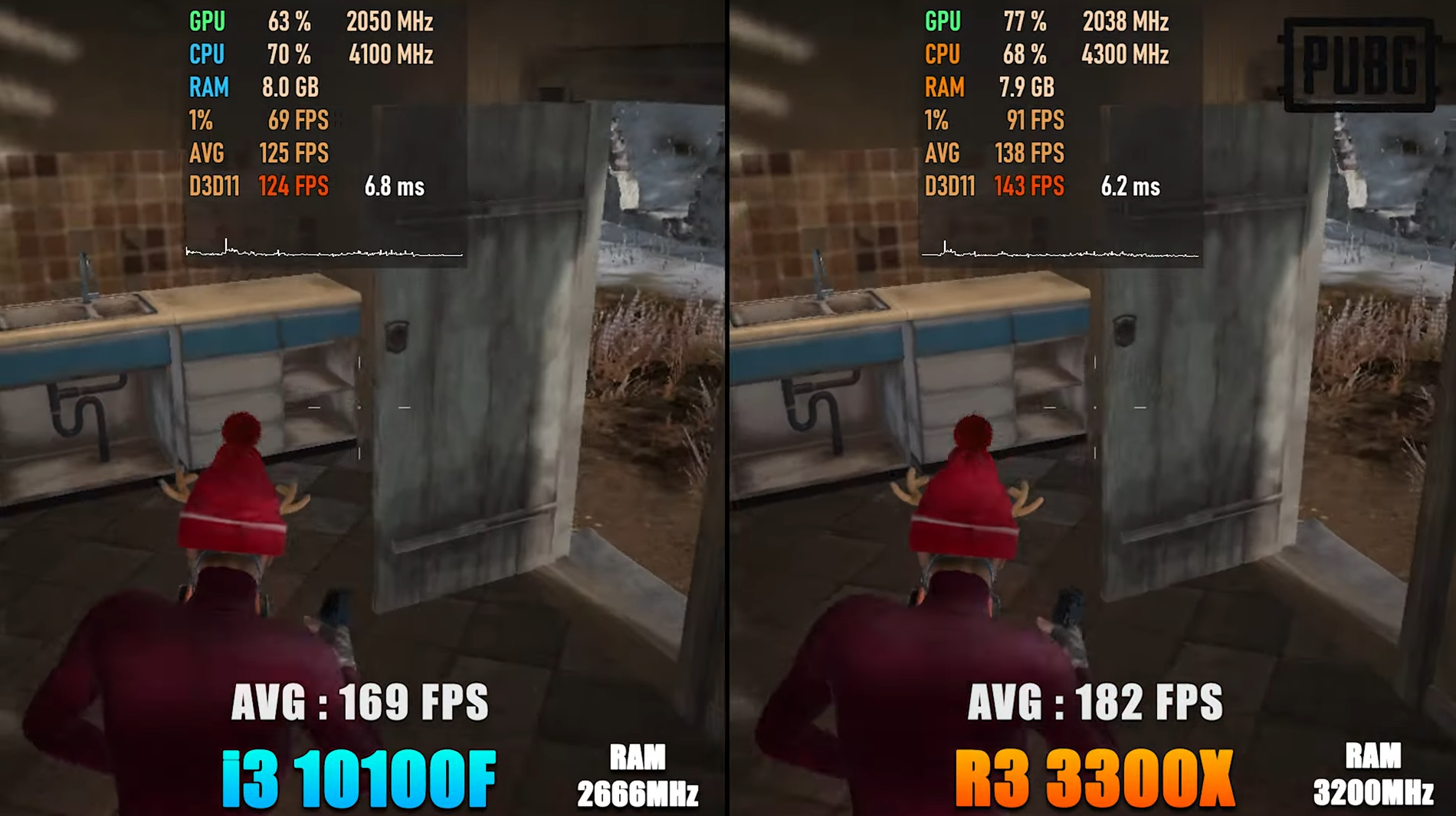 배틀그라운드 매우 낮음에서 FHD 기준으로 각 평균 프레임은 169, 182로 라이젠 3300X가 인텔 i3-10100F에 비해 약 8% 우세한 성능을 보여주었습니다.