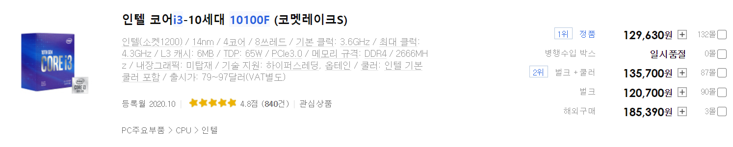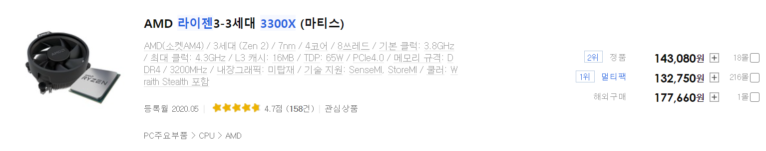 129,630(i3-10100F, 정품) vs 132,750(3300X, 멀티팩)