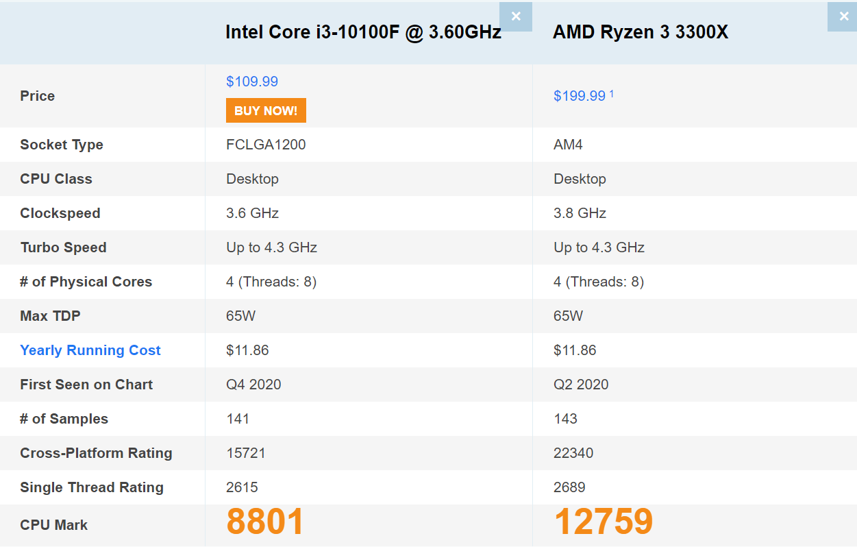 cpubenchmark.com에서 확인한 결과 라이젠 3300X가 인텔 i3-10100F 비해 약 45% 우세한 멀티 성능을 보여주었습니다.
