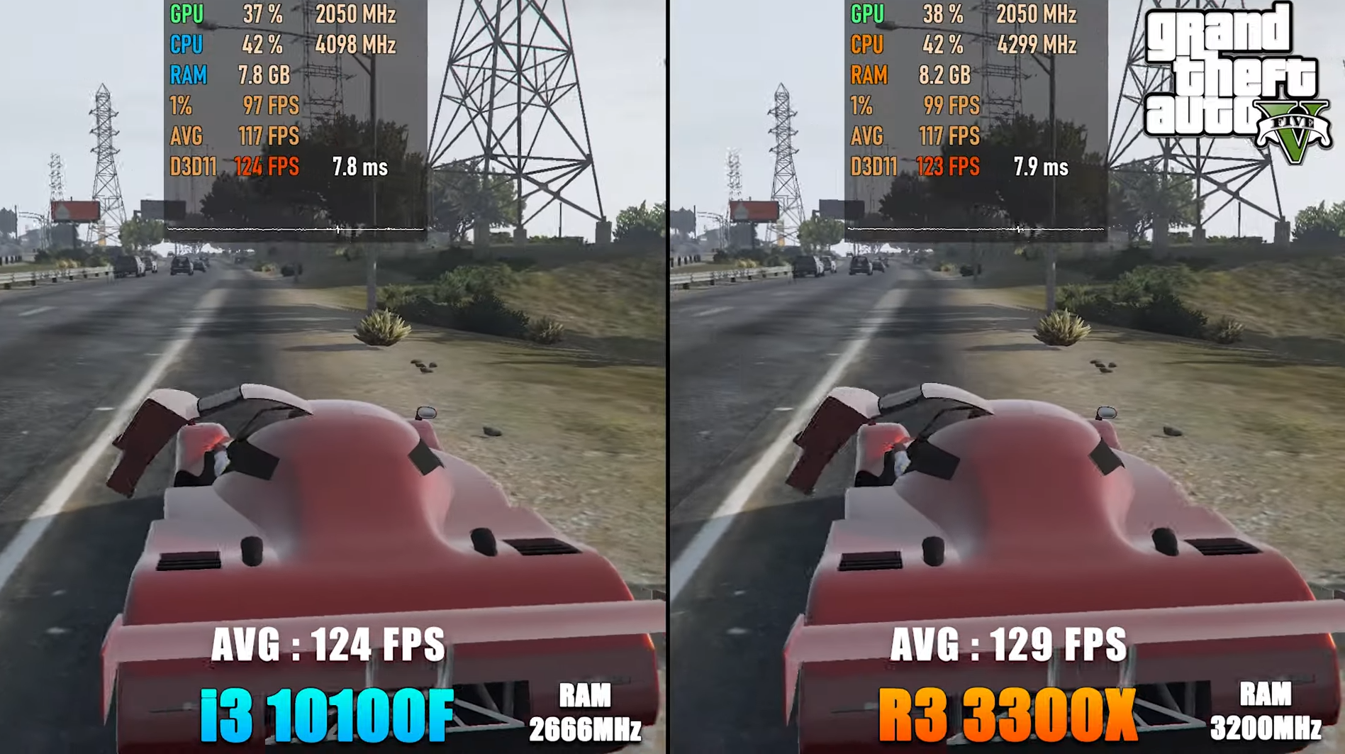 GTA5 낮음에서 FHD 기준으로 각 평균 프레임은 124, 129로 라이젠 3300X가 인텔 i3-10100F에 비해 약 4% 우세한 성능을 보여주었습니다.