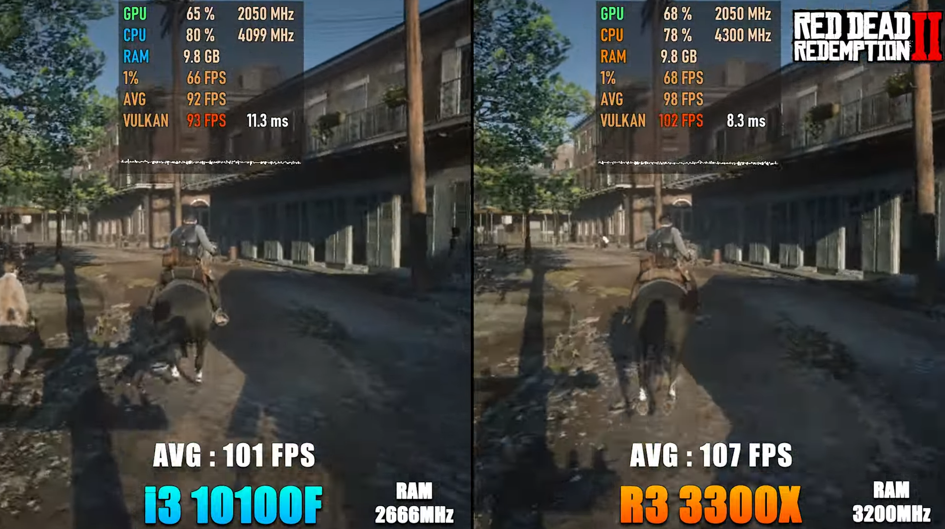 레드 데드 리뎀션 2 낮음에서 FHD 기준으로 각 평균 프레임은 101, 107로 라이젠 3300X가 인텔 i3-10100F에 비해 약 6% 우세한 성능을 보여주었습니다.