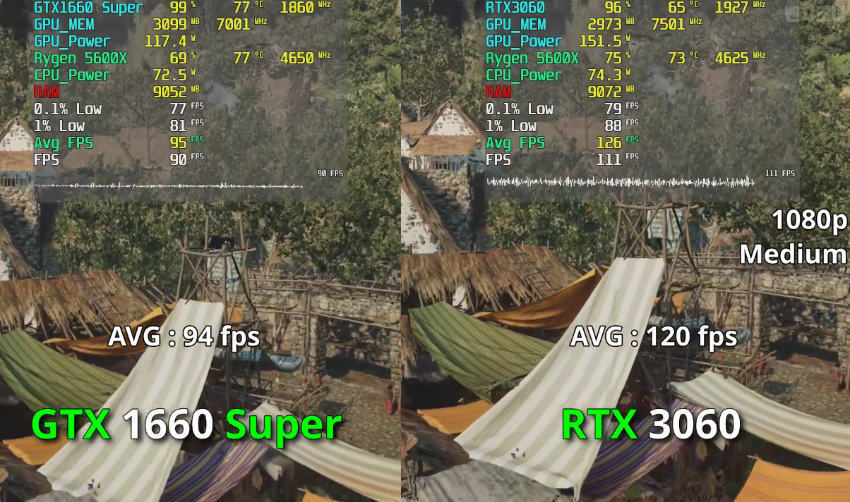 배틀그라운드 울트라에서 돌렸을 때 FHD 기준으로 각 평균 프레임은 94, 120으로 RTX3060이 GTX1660 Super보다 약 28% 우세한 성능을 보여주었습니다.