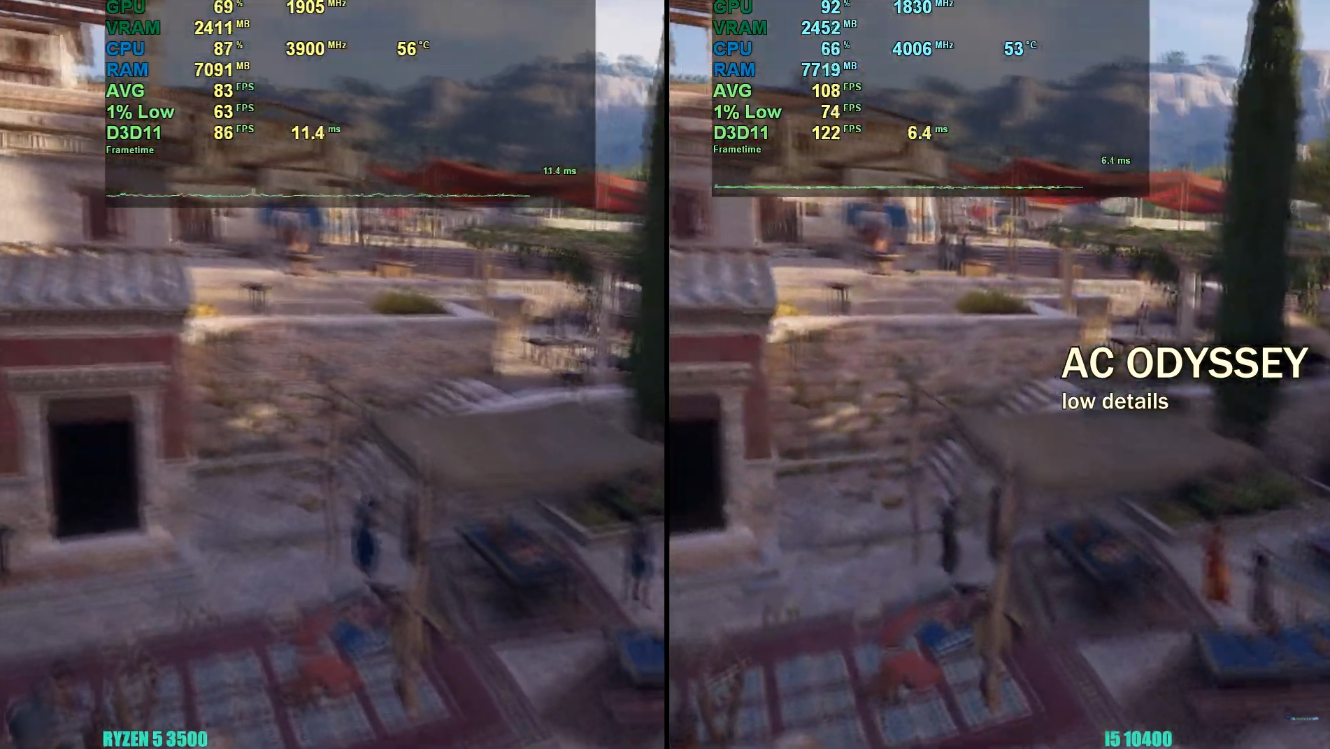어쌔신 크리드 오디세이 낮음에서 FHD 기준으로 각 평균 프레임은 84, 110으로 인텔 i5-10400F가 라이젠 3500에 비해 약 31% 우세한 성능을 보여주었습니다.