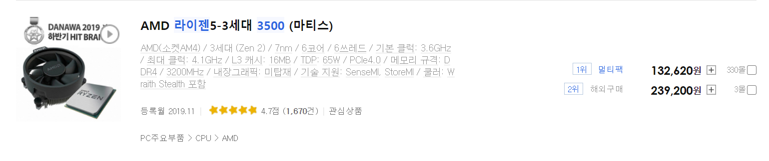 165,800(i5-10400F, 정품) vs 132,620(3500, 멀티팩)