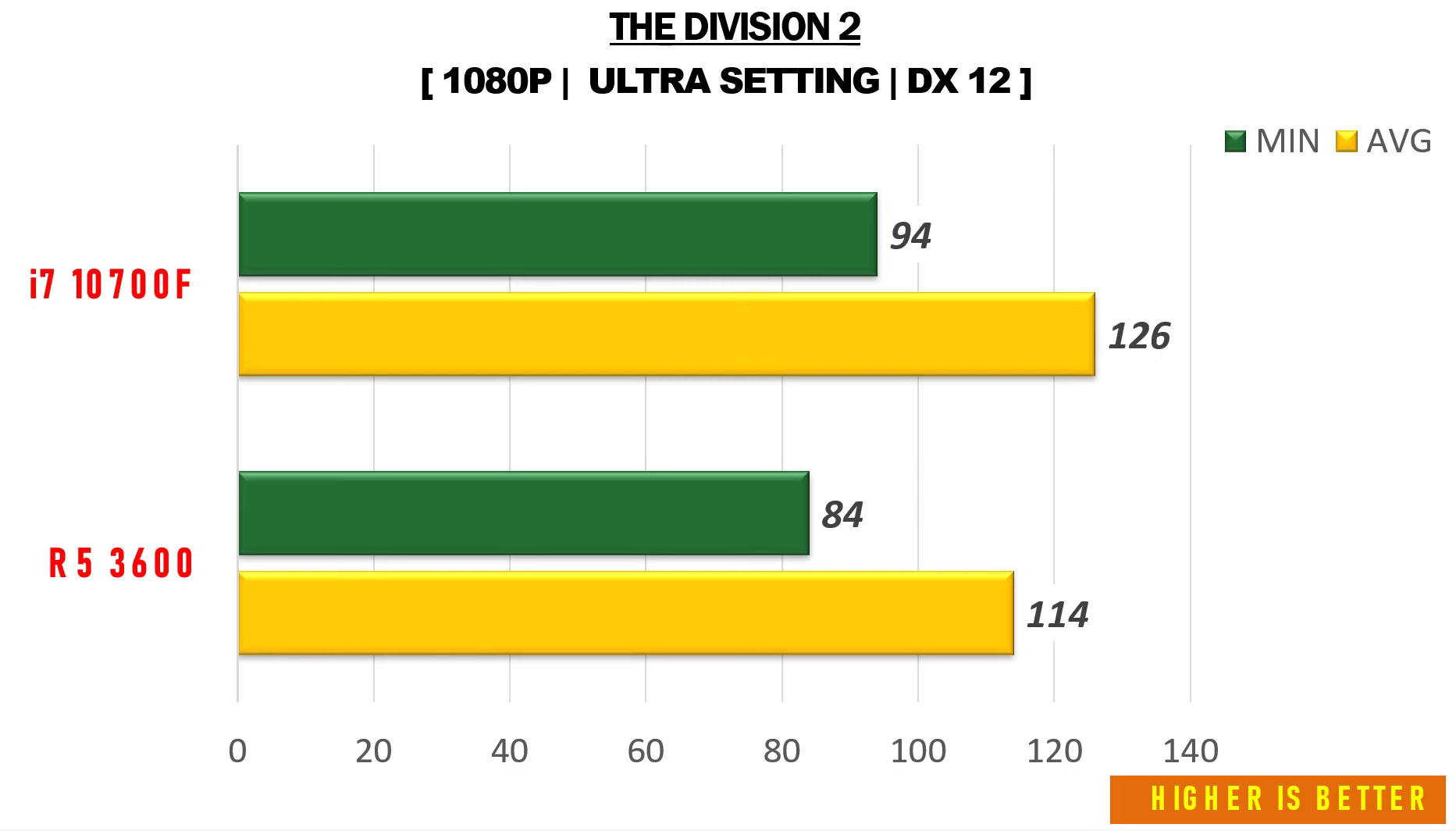 더 디비전 2 울트라에서 FHD 기준으로 각 평균 프레임은 114, 126으로 인텔 i7-10700F가 라이젠5 3600에 비해 약 10% 우세한 성능을 보여주었습니다.