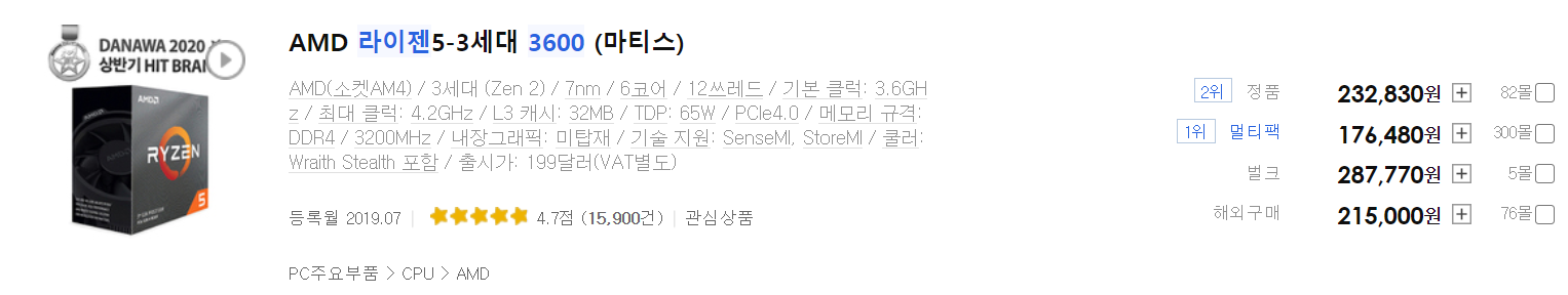 2021.03.21 기준으로 인텔 i7-10700F에 거의 2배 가까이 차이 나는 것을 알 수 있습니다. 인텔 i7-10700F보다 좋은 CPU가 맞지만 가성비 측면에서 볼 때는 라이젠 3600이 더 좋은 것 같네요.