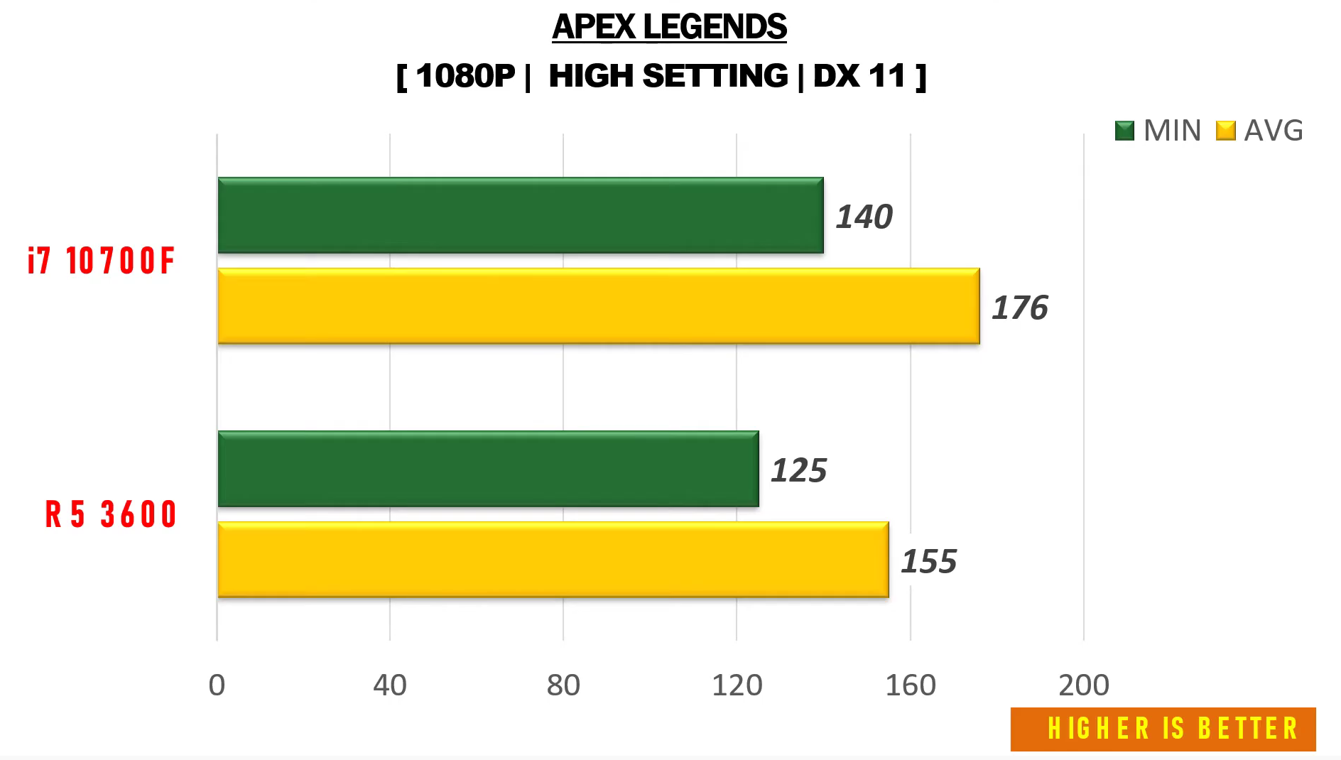 에이펙스 레전드 높음에서 FHD 기준으로 각 평균 프레임은 155, 176으로 인텔 i7-10700F가 라이젠5 3600에 비해 약 13% 우세한 성능을 보여주었습니다.