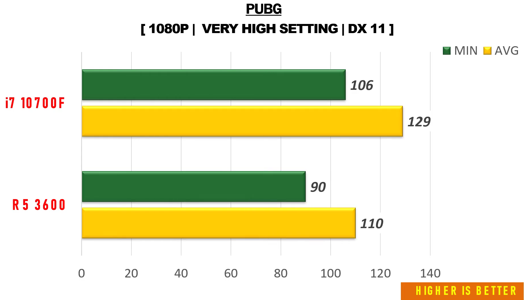 배틀그라운드 매우 높음에서 FHD 기준으로 각 평균 프레임은 110, 129으로 인텔 i7-10700F가 라이젠5 3600에 비해 약 17% 우세한 성능을 보여주었습니다.