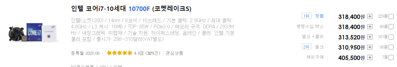 176,480(3600, 멀티팩) vs 318,400(10700F, 정품)
